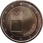 Carré similaire au logo d l'Université de Ljubljana surmonté du texte 100 LET UNIVERZE V LJUBLJANI (100 ans Université de Ljubljana) en trois lignes, sur un fond texturé. Le mot LET est placé verticalement. En bas, à droite, la mention du pays émetteur et le millésime SLOVENIJA 2019. L'anneau externe de la pièce comporte les douze étoiles du drapeau européen.