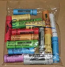 Ces pièces ont été mises en circulation le mais, comme pour tous les autres membres (les 12 plus Monaco, le Vatican et Saint-Marin), des kits euro de démarrage ont été fabriqués contenant chacun la valeur de 12,52 € soit 44 pièces : 8 pièces de 0,01 €, 7 pièces de 0,02 €, 6 pièces de 0,05 €, 6 pièces de 0,10 €, 7 pièces de 0,20 €, 4 pièces de 0,50 €, 4 pièces de 1,00 € et 2 pièces de 2,00 €. La valeur du kit euro de démarrage slovène est donc de 3 000.00 SIT (Tolar).