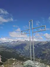 La croix sommitale ; à l'arrière-plan, le Valtournenche et le mont Rose.