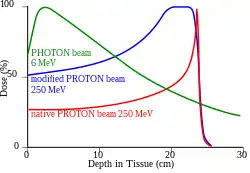 Le phénomène du pic de Bragg est exploité en radiothérapie, lors du traitements de cancers (particulièrement des cancers localisés près de l’œil ou du cerveau et autrement inopérables), pour concentrer les effets du faisceau de radiation sur la tumeur à traiter en épargnant autant que possible les tissus sains environnants. La courbe bleue de la figure (« faisceau de protons modifiés ») montre comment le faisceau originel monoénergétique, avec le pic très étroit, peut être élargi (plus grand spectre énergétique) pour traiter une tumeur plus volumineuse. On peut obtenir le même effet en utilisant des atténuateurs (des caches d’épaisseur variable, ajustés au cas à traiter).
