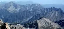 Massif de l'Ardiden en arrière-plan, depuis le Vignemale : pic de Cestrède (droite), pic de Chanchou et pic de Barbe de Bouc (centre) et pic d'Ardiden (gauche).