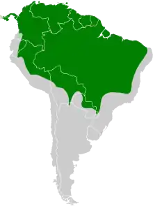 Son aire de répartition s'étend sur le Panamá, la Colombie, Trinité-et-Tobago, le Venezuela, le Guyana, le Suriname, la Guyane, le Brésil, l'Argentine, le Paraguay, la Bolivie, le Pérou et l'Équateur.