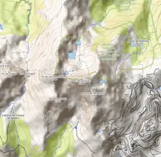 - les toponymes forgés sur l'étang Tort (i.e. « étang tordu », par évocation de sa forme) niché sur ses pentes à 2 097 mètres : pic de l'Estang Tort (vers 1790), pic de l'Estangtot, voire pic de Lestanglot (1827) ;