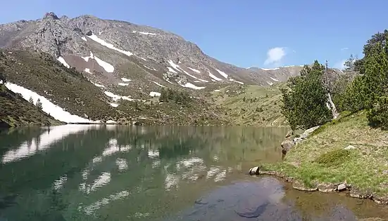 | Pic del Port Vell sur la carte géologique de l'Andorre. | Pic del Port Vell surplombant l'estany de les Truites. |