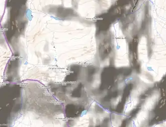 - Par le refuge du Pinet situé à côté du lac du même nom : ce chemin, balisé en rouge et blanc, est désormais l'itinéraire le plus emprunté, car plus facile, notamment pour la descente. C'est l'itinéraire utilisé lors de la première[10] (18 juillet 1807) relatée par Augustin Pyrame de Candolle, à partir du camp établi à l'étang Sourd, après une tentative infructueuse effectuée la veille par la voie plus directe de l'arête N (cap de la Desse, pointe du Montcalm)[11].