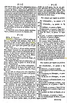 L'Encyclopédie méthodique donne « 12 escaits pour faire le picotin, chaque escait de 12 pics, mesure d’Agen, qui est environ trois lignes plus grande que le pié-de-roi. [définition par] Savari »[5].
