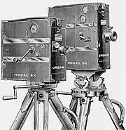 Elles sont animées par deux manivelles. Sur cette photo, Charles Chaplin vérifie le cadrage d’un plan avec la caméra Bell-Howell 2709 montée sur un trépied en bois dont la tête est activée par les deux petites manivelles que l’on voit devant (réglage vertical) et sur le côté (réglage horizontal). La manipulation des manivelles nécessite une habileté ambidextre que n’exige pas le "manche", et la position de visée avec ce dispositif implique un certain recul par rapport à la caméra. Le cadreur se tient droit (viseur clair latéral).