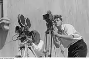 Cadreur de télévision utilisant un trépied en bois sur un Y en tubes légers sur roulettes (années 1950).