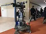 - Dolly à bras modulables : les différents bras équipés de roues peuvent être écartés ou repliés individuellement par commodité (notamment par rapport aux obstacles du décor) tout en gardant un parallélogramme de sustentation suffisant pour conserver l’équilibre de la caméra.