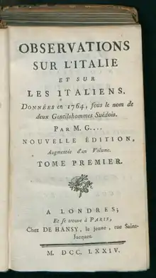 - Nouveaux Mémoires ou observations sur l’Italie et sur les Italiens, par deux gentilshommes suédois, Londres, 1764, 3 vol. in-12 ; 1770, 5 vol. in-12 ; Londres, Lausanne, 1770, 3 vol. in-12; 1774, 4 vol. in-12 ;