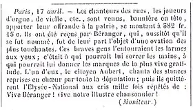 Béranger est adoré par les chanteurs et musiciens des rues de Paris qui lui rendent hommage au nombre de 800 en 1848. Il est l'ami de leur doyen et syndic Aubert.