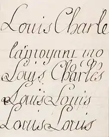 - Sont récemment passés en vente[8] deux feuillets d’écriture de Louis XVII, tracés vers 1790-1791, avec les mots « Louis, Charles, larmoyant » (155 x 195 mm). Cet essai montre un mot sur lequel des guides des hampes ont été tracés au crayon, probablement par Sourdon Dumesnil de Saint-Cyr. Ce document provient de la collection de Prosper Tarbé (1809-1871), dont le gros fut donné à la ville de Reims.