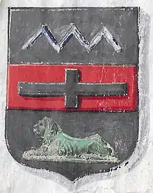 D’argent à une fasce de gueules, chargée d’une croix alaisée d’argent, accompagnée en chef d’une divise vivrée d’azur, et en pointe d’un sphinx couché de sinople. L’Ecu timbré d’un casque d’argent taré de profil. |