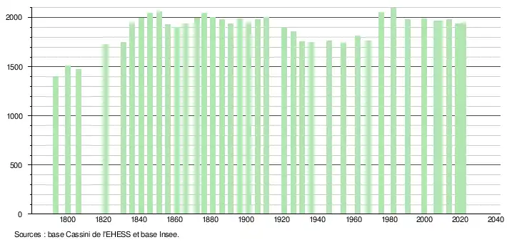 L'évolution du nombre d'habitants est connue à travers les recensements de la population effectués dans la commune depuis 1793. Pour les communes de moins de 10 000 habitants, une enquête de recensement portant sur toute la population est réalisée tous les cinq ans, les populations légales des années intermédiaires étant quant à elles estimées par interpolation ou extrapolation[15]. Pour la commune, le premier recensement exhaustif entrant dans le cadre du nouveau dispositif a été réalisé en 2008[16].