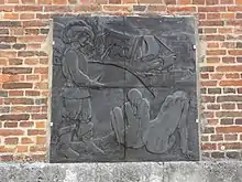 Bas-relief Pierre Belain d'Esnambuc à Allouville-Bellefosse. - Un bas-relief, approximativement carré de 90 cm de côté, sculpté dans de l'ardoise, est fixé depuis 1985, pour le quatrième centenaire de sa naissance, sur la partie basse du mur sud du clocher-porche, celui sur laquelle est apposée en haut l'horloge, côté rue du Docteur-Patenotre, face au chêne millénaire, à Allouville-Bellefosse[17].