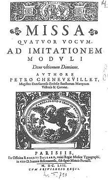 - Missa quatuor vocum ad imitationem moduli Deus ultionum Dominus authore Petro Cheneveuillet, magistro Ennesiacensis Sanctorum Martyrum Victoris & Coronae. Paris : Robert III Ballard, 1653. 2°. Guillo 2003 n° 1653-E, RISM C 2015. Outre l’exemplaire de Paris BNF (Mus.) : RES-F-758, on connaît celui de Chicago NL : Case folio M2011.M625 S253 1736 (pièce 4).