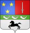 Coupé ; au I, parti d’azur à trois étoiles d'or, et de gueules à l'épée haute en pal d'argent; au II, d'argent au cheval libre de sable ; au chef de sinople chargé de trois cors d'argent.[2]