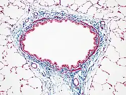 - Trichrome de Masson[2],[3]: coloration histologique associant à l'hématoxyline (coloration nucléaire), la fuchsine-Ponceau (coloration cytoplasmique) et le vert lumière ou le bleu d'aniline (coloration élective du collagène).