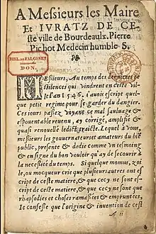 - Pierre Pichot, Description de la peste à Bordeaux (1564), Bordeaux, Veuve Morpain, , 73 p. (disponible sur Internet Archive). Le seul exemplaire connu de ce livre est dépourvu de la page titre[12].