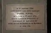 Plaque commémorative au 128, rue du Bac à Paris, à l'entrée des Missions étrangères de Paris, où Pierre Poivre vint en 1740 avant son voyage.