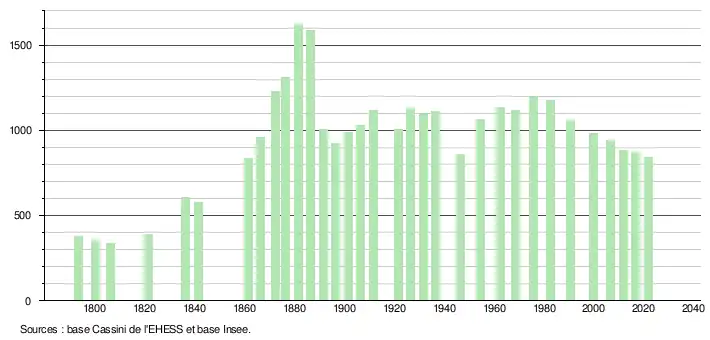 L'évolution du nombre d'habitants est connue à travers les recensements de la population effectués dans la commune depuis 1793. Pour les communes de moins de 10 000 habitants, une enquête de recensement portant sur toute la population est réalisée tous les cinq ans, les populations légales des années intermédiaires étant quant à elles estimées par interpolation ou extrapolation[17]. Pour la commune, le premier recensement exhaustif entrant dans le cadre du nouveau dispositif a été réalisé en 2006[18].