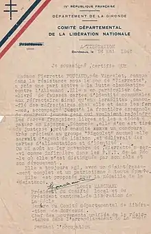 - Attestation d'appartenance au réseau Buckmaster (SOE) agent permanent P1 du 1er septembre 1943 au 30 septembre 1944.