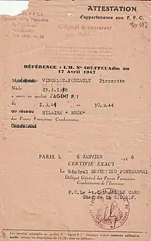 - Certificat d’appartenance aux Forces françaises combattantes (FFC) no 34387