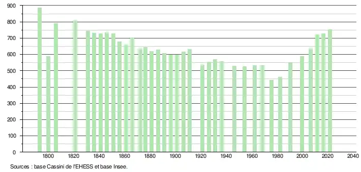 L'évolution du nombre d'habitants est connue à travers les recensements de la population effectués dans la commune depuis 1793. Pour les communes de moins de 10 000 habitants, une enquête de recensement portant sur toute la population est réalisée tous les cinq ans, les populations légales des années intermédiaires étant quant à elles estimées par interpolation ou extrapolation[22]. Pour la commune, le premier recensement exhaustif entrant dans le cadre du nouveau dispositif a été réalisé en 2006[23].