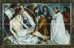 Fouquet met en œuvre une composition très originale qui ne connaît aucun équivalent à l'époque, si ce n'est peut-être dans une descente de croix d'Hugo van der Goes. Mais celle-ci n'est que partiellement conservée au Christ Church college d'Oxford et simplement connue par des dessins et des répliques. On y retrouve le même regroupement de personnages au premier plan. Il use d'une géométrie très stricte faite de croisements de lignes autour du corps du Christ qui forme un triangle avec la tête de saint Jean[17].