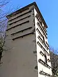 On trouve des ouvertures superposées, quatre sur la face sud-est et douze sur la face nord-ouest, encadrant quatre grandes fenêtres. Des planchettes soutenues par des consoles de bois servent de table d'envol.