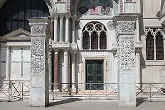 Les deux piliers, situés sur la piazzetta devant le portail sud de la basilique Saint-Marc, ont longtemps été attribués, sur la foi d'une chronique vénitienne du XIVe siècle à un atelier de sculpture syrien. Les 23-, Lorenzo Tiepolo remporte en effet une grande victoire navale sur l'amiral génois Rosso della Turca au large de Saint-Jean-d'Acre[1] : c'est pour commémorer cette victoire contre leurs rivaux que les Vénitiens auraient rapporté du quartier génois d'Acre deux grands piliers sculptés appartenant à une église Saint-Sabas datée du VIe siècle, qu'ils auraient installés sur le côté sud de la basilique Saint-Marc, non loin du mur orné par les dépouilles du sac de Constantinople en 1204, dont le célèbre groupe des Tétrarques de Saint-Marc[2].