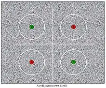Deux équipes de deux joueurs s'affrontent sur le terrain ainsi délimité en quelques minutes. Les équipes sont disposées en diagonale par rapport au centre de la croix. Chaque joueur défend un cercle. Un joueur engage en lançant le pilou à la main depuis son cercle à son partenaire qui le reçoit du coup de pied ou de la cuisse. Celui-ci tout en jonglant avec le pied et la cuisse (le genou en fait) doit amener le pilou vers l'un des cercles des adversaires pour l'y déposer. L'adversaire attaqué, qui doit rester dans sa zone (délimitée par les branches de la croix) lui fait obstruction et essaye de faire tomber le pilou dans son camp mais hors de son cercle pour gagner le pilou et engager à son tour. Les attaquants peuvent entrer dans la zone de l'adversaire. L'attaqué se défend seul puisque son coéquipier doit lui aussi rester dans sa zone.