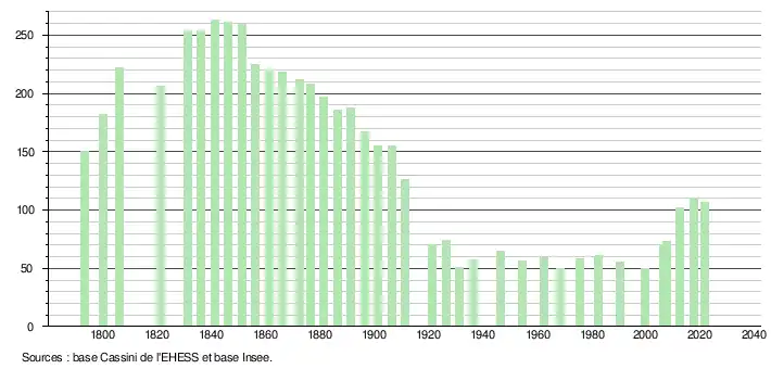L'évolution du nombre d'habitants est connue à travers les recensements de la population effectués dans la commune depuis 1793. Pour les communes de moins de 10 000 habitants, une enquête de recensement portant sur toute la population est réalisée tous les cinq ans, les populations légales des années intermédiaires étant quant à elles estimées par interpolation ou extrapolation[15]. Pour la commune, le premier recensement exhaustif entrant dans le cadre du nouveau dispositif a été réalisé en 2007[16].