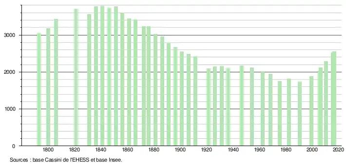 L'évolution du nombre d'habitants est connue à travers les recensements de la population effectués dans la commune depuis 1793. Pour les communes de moins de 10 000 habitants, une enquête de recensement portant sur toute la population est réalisée tous les cinq ans, les populations légales des années intermédiaires étant quant à elles estimées par interpolation ou extrapolation[22]. Pour la commune, le premier recensement exhaustif entrant dans le cadre du nouveau dispositif a été réalisé en 2005[23].