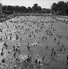 - Piscine d'été avec des gradins pouvant accueillir 2 000 spectateurs inaugurée en 1931, c'est aussi le plus grand bassin extérieur de France (150 × 48 m)[3]. Mais ce bassin n'a pas la classification piscine de par sa faible profondeur.