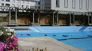 La piscine est créée en 1920 avec deux bassins qui furent le lieu de développement du water-polo, du plongeon dans un idéal de développement corporel par le sport. L'architecte en est Jacques Rapin. La piscine est en béton armé. Les deux plongeoirs qui existaient à l'origine ont disparu. Elle est classée au titre des monuments historiques pour son décor de pergola et mosaïque. Le béton autour du bassin est de teinte rouge en souvenir des décors antiques[6].