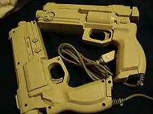 La console de jeu vidéo Dreamcast comprend plusieurs pistolets optiques (light guns) sortis entre les années 2000 et 2003. Le pistolet optique officiel conçu par Sega sort en Europe et en Asie, mais pas aux États-Unis en raison de préoccupations au sujet de la mauvaise presse peu après la fusillade de Columbine. Au lieu de ce modèle un pistolet optique sous licence officielle est lancé par Mad Catz sur le marché nord-américain.