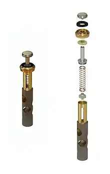 - le ressort de rappel : il maintient le piston en position haute par défaut. Sa raideur fait l'objet d'un compromis délicat entre rapidité et facilité d'exécution. Selon le modèle, le ressort peut être intégré au piston ou inséré séparément dans la chambre, sous le piston (ceci est surtout le cas pour des gros instruments tels que l'euphonium et le tuba)