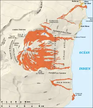 Le piton de la Fournaise forme la partie actuellement active d'un volcan bouclier plus large : le massif du Piton de la Fournaise dont les roches les plus anciennes connues ont été formées il y a environ 530 000 ans[10]. Ce massif constitue avec le massif du Piton des Neiges, d'âge plus ancien, l'île de La Réunion telle qu'on la voit de nos jours.