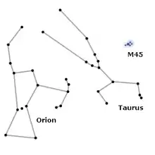 - En Mésopotamie, la Série MUL.APIN, le premier traité d'astronomie mésopotamienne connu, découvert à Ninive dans la bibliothèque d'Assurbanipal et datant au plus tard de 627 av. J.C., mais qui rassemble des données parfois largement antérieures à cette époque, présente une liste de dieux [titulaires d'étoiles] qui se tiennent sur « le chemin de la Lune », liste qui commence par mul.MUL soit M 45[5],[6].
