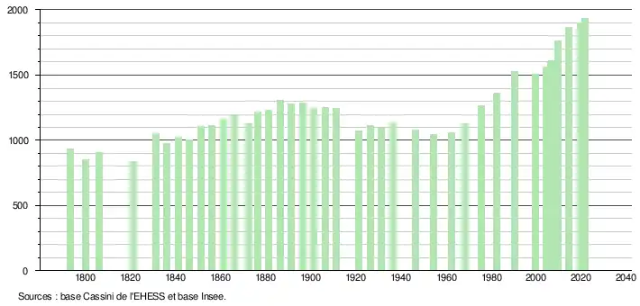 L'évolution du nombre d'habitants est connue à travers les recensements de la population effectués dans la commune depuis 1793. Pour les communes de moins de 10 000 habitants, une enquête de recensement portant sur toute la population est réalisée tous les cinq ans, les populations légales des années intermédiaires étant quant à elles estimées par interpolation ou extrapolation[20]. Pour la commune, le premier recensement exhaustif entrant dans le cadre du nouveau dispositif a été réalisé en 2004[21].