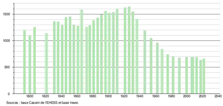 L'évolution du nombre d'habitants est connue à travers les recensements de la population effectués dans la commune depuis 1793. Pour les communes de moins de 10 000 habitants, une enquête de recensement portant sur toute la population est réalisée tous les cinq ans, les populations légales des années intermédiaires étant quant à elles estimées par interpolation ou extrapolation[41]. Pour la commune, le premier recensement exhaustif entrant dans le cadre du nouveau dispositif a été réalisé en 2007[42].