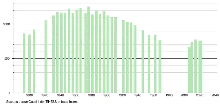 L'évolution du nombre d'habitants est connue à travers les recensements de la population effectués dans la commune depuis 1793. Pour les communes de moins de 10 000 habitants, une enquête de recensement portant sur toute la population est réalisée tous les cinq ans, les populations légales des années intermédiaires étant quant à elles estimées par interpolation ou extrapolation[24]. Pour la commune, le premier recensement exhaustif entrant dans le cadre du nouveau dispositif a été réalisé en 2004[25].