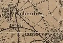 Carte pratique des environs de Paris, gravure L. Sonnet, 1880, échelle 1/200000 environ. Le carrefour est une des principales intersections, sur la route joignant Asnières et Colombes.