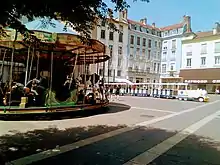- Aujourd'hui, la place reste le cœur de la ville où se trouvent de nombreux commerces et restaurants. La fontaine située au fond de la place non loin de l'ancien hôtel de ville, dénommée Château d'eau Lavalette, a été mise en service en 1827[18] après l'administration du marquis de Lavalette, alors maire sortant de Grenoble et créateur du premier réseau de canalisation des fontaines de la ville. Cette fontaine a été conçue par le sculpteur Victor Sappey et produite par le fondeur Crozatier. Le monument réalisé en pierre de Sassenage, est orné de quatre angelots chevauchant des dauphins en bronze, emblèmes du Dauphiné[19].