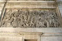 Ce grand bas-relief situé sous l’arcade contre le pilier ouest est intitulé « Le retour dans le foyer » ou encore « Les braves recevant de la Patrie la récompense de leurs exploits ». L’artiste utilise également ses familiers comme modèle de sculpture.