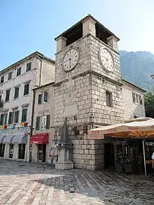 La tour de l'Horloge a été construite au XVIIe siècle. Elle a été bâtie en partie dans le style baroque, tandis que les façades nord et est ont été construites en style gothique[1]. A noter que depuis le tremblement de terre de 1667, elle penche. Un pilori médiéval reconstitué, en forme d'obélisque, se dresse devant la tour.