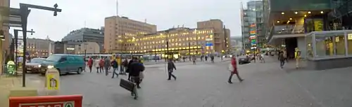 A l'avant la place de la gare centrale d'Helsinki et au fond la place d'Eliel | |
