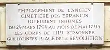 La guillotine y est provisoirement déplacée depuis la place du Carrousel en , pour y décapiter, sur le lieu même de leur forfait, certains des voleurs des joyaux de la Couronne dont le diamant bleu de la Couronne[16]. Elle réapparaît ponctuellement le 2 pluviôse an I () pour l'exécution de Louis XVI ; unique cas où elle est dressée à l'ouest de la place, à mi-distance du piédestal central et de l'entrée des Champs-Élysées. C'est enfin le 22 floréal an I () qu'elle s'y fixe à demeure, pour y rester jusqu'au 21 prairial an II (), veille de l'instauration de la loi du 22 prairial an II instaurant la grande Terreur, et cette fois à l'est de la place, entre le centre et l'entrée du jardin des Tuileries. Sur les 2 498 personnes guillotinées à Paris pendant la Révolution, 1 119 le sont place de la Révolution. Parmi elles, outre Louis XVI, on retiendra les noms de Marie-Antoinette, Charlotte Corday, madame Roland, les Girondins, Philippe d'Orléans, madame du Barry, Danton, Malesherbes et Lavoisier…