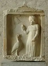 Les filles athéniennes ne sont pas formellement éduquées, leur mère leur enseignent les compétences domestiques nécessaires pour gérer un ménage. L'éducation formelle des garçons comprend la rhétorique, nécessaire à une participation politique efficace, et une éducation physique en préparation à leur service militaire comme éphèbe. Ces compétences ne sont pas jugées nécessaires pour la femme[41]. L'art classique montre des filles et des garçons jouant avec des jouets comme des toupies, des cerceaux et des balançoires, et pratiquant des jeux tels que le ferroutage[42]. La pierre tombale de Plangon, une Athénienne âgée d'environ cinq ans, exposée à la Glyptothèque de Munich, la montre tenant une poupée ; un ensemble d'osselets figure sur un mur en arrière-plan[43].